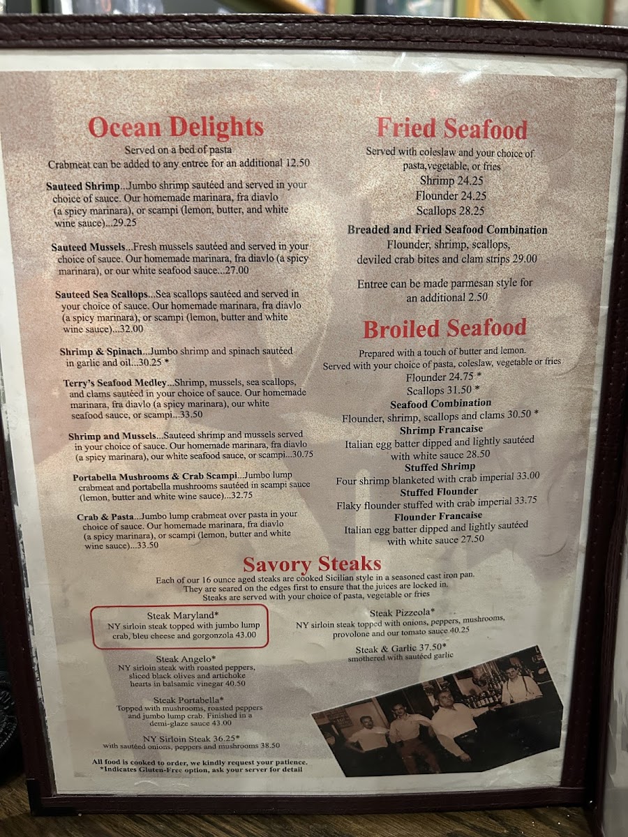 The menu boasts a range of enticing offerings, starting with cold appetizers like Bruschetta and Roasted Red Peppers & Provolone, setting the stage for a delightful dining experience. For seafood lovers, the Ocean Delights section shines, featuring fresh shrimp and mussels in homemade sauces that elevate each dish.